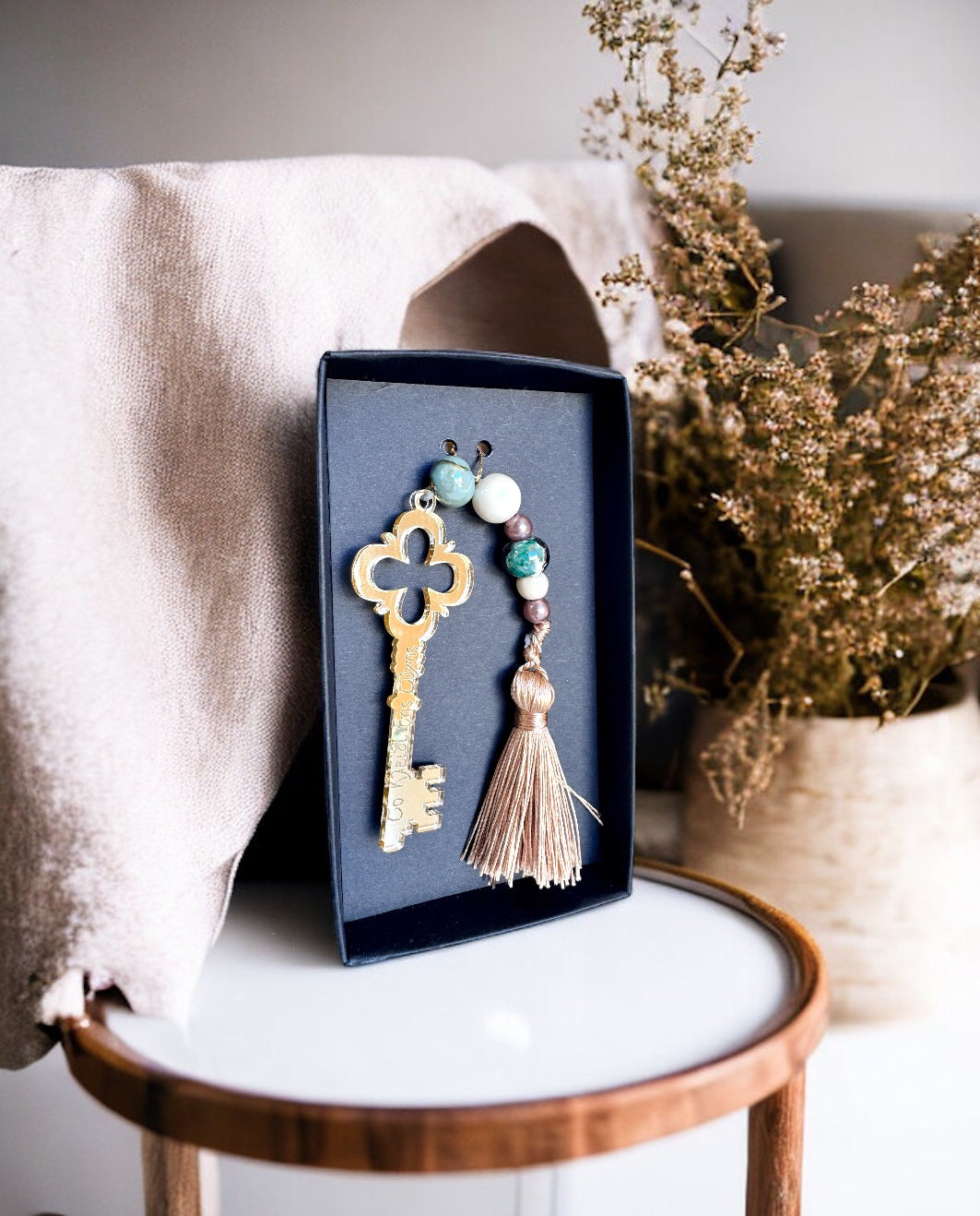 Ένα διακοσμητικό γούρι σε σχήμα τυχερού κλειδιού είναι μια υπέροχη επιλογή που συνδυάζει αισθητική και συμβολισμό. Το κλειδί δεν είναι απλώς ένα εργαλείο, αλλά και ένα σύμβολο που αντιπροσωπεύει την πρόσβαση σε νέες ευκαιρίες, επιτυχίες και χαρές. Είναι κατασκευασμένο από χρυσό plexiglass, με κεραμικές χρωματιστές χάντρες.