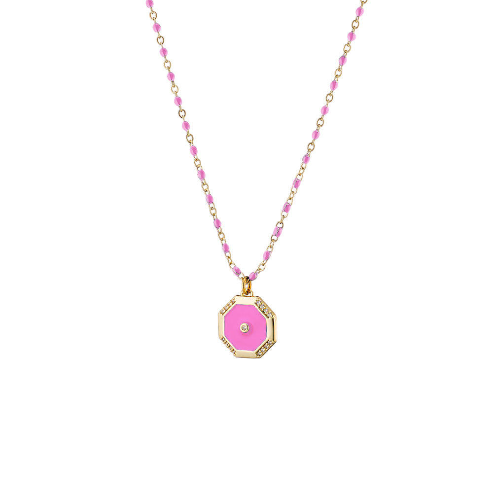 Το χαρακτηριστικό στοιχείο της συλλογής σε ιδιαίτερο πολυγωνικό σχήμα έρχεται με λευκό mop, είτε με μπλε ή ροζ σμάλτο, ενώ ξεχωρίζουν με τα χρώματά τους οι αλυσίδες από ροζάριο αλλά και τα λαμπερά λευκά ζιργκόν που το συνοδεύουν.