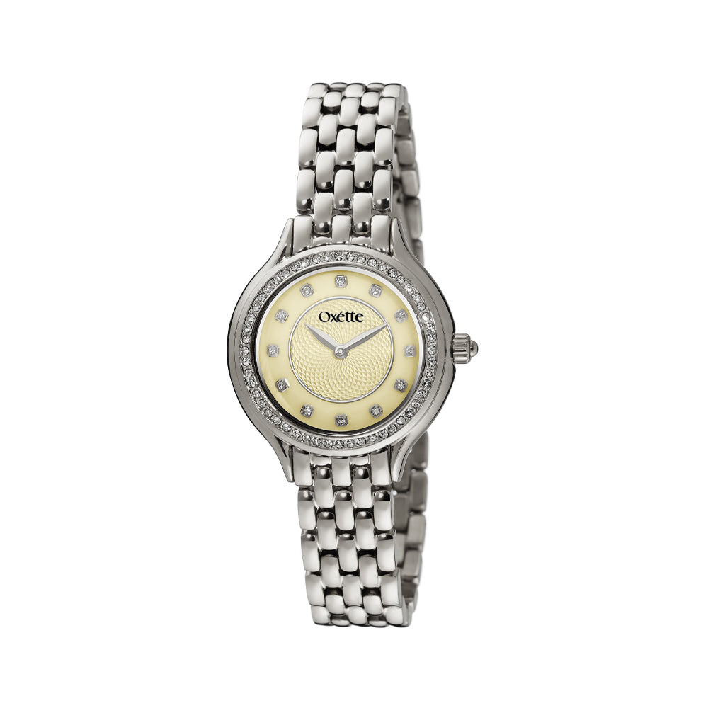Το ρολόι αυτό έχει ιδανικό μέγεθος, minimal σχεδιασμό και μια σειρά από διακριτικά κρύσταλλα στη στεφάνη του, ενώ το μοναδικό του καντράν διακοσμείται από mother of pearl, λαμπερά κρύσταλλα, καθώς και ένα όμορφο σχέδιο στο κέντρο.