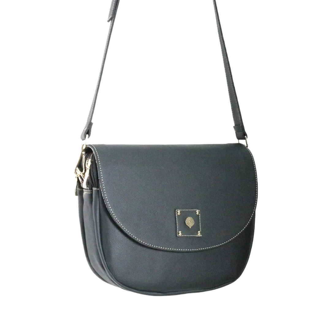 Χιαστί τσάντα πόλης από τεχνητό δέρμα με διακριτικές μεταλλικές λεπτομέρειες και χοντρό λουράκι που ρυθμίζεται στο επιθυμητό ύψος. Διαθέτει τρία εξωτερικά φερμουάρ με αντίστοιχες θήκες, καθώς και μία εσωτερική θήκη που κλείνει με φερμουάρ και θήκη κινητού. Το καπάκι κλείνει με μαγνητικό κλίπ.