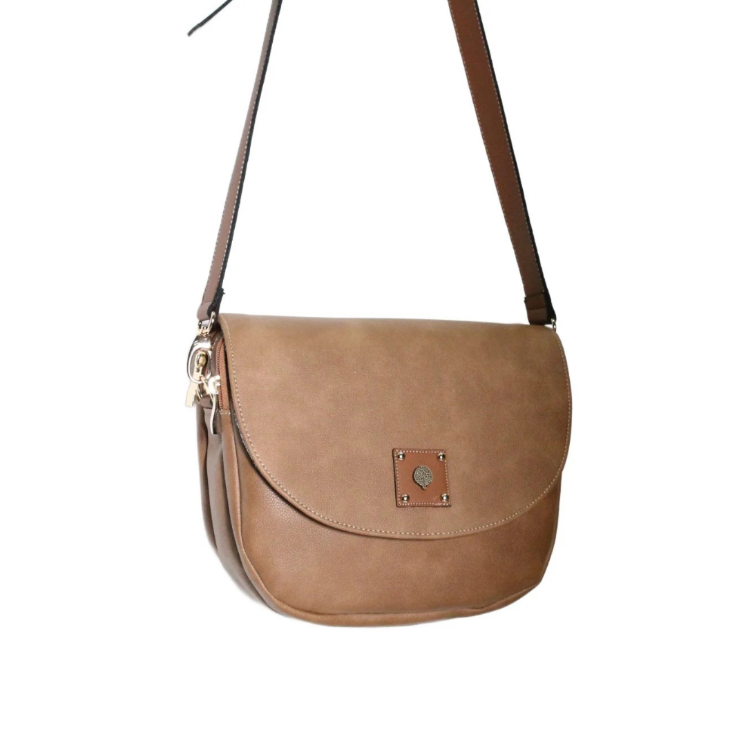 Χιαστί τσάντα πόλης από τεχνητό δέρμα με διακριτικές μεταλλικές λεπτομέρειες και χοντρό λουράκι που ρυθμίζεται στο επιθυμητό ύψος. Διαθέτει τρία εξωτερικά φερμουάρ με αντίστοιχες θήκες, καθώς και μία εσωτερική θήκη που κλείνει με φερμουάρ και θήκη κινητού. Το καπάκι κλείνει με μαγνητικό κλίπ.