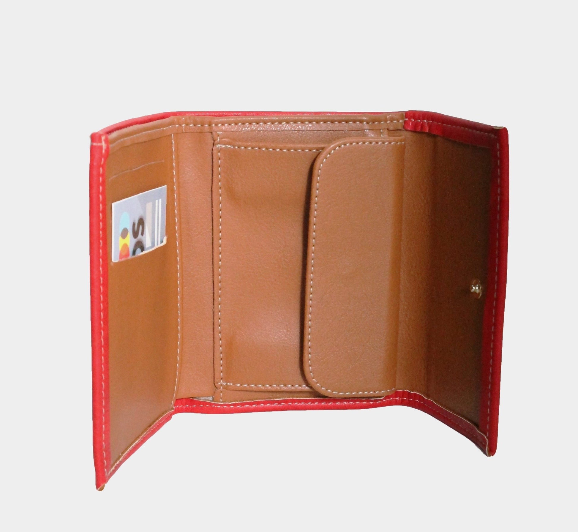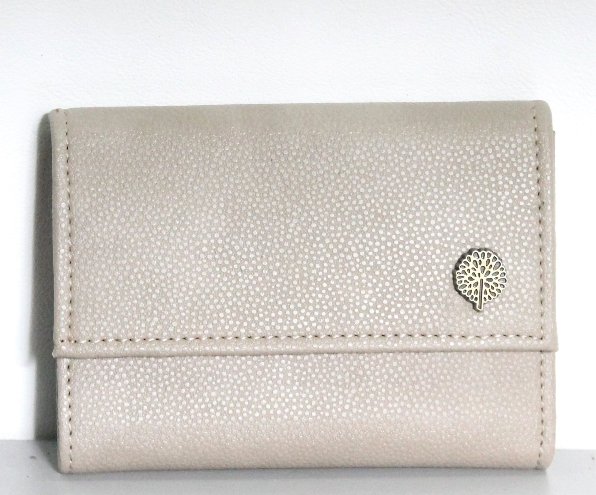 Πορτοφόλι από τεχνητό δέρμα με χρυσές λεπτομέρειες. Διαθέτει θήκες για χαρτονομίσματα, κάρτες, ταυτότητα, κέρματα και κλείνει με μαγνητικό κλιπ.