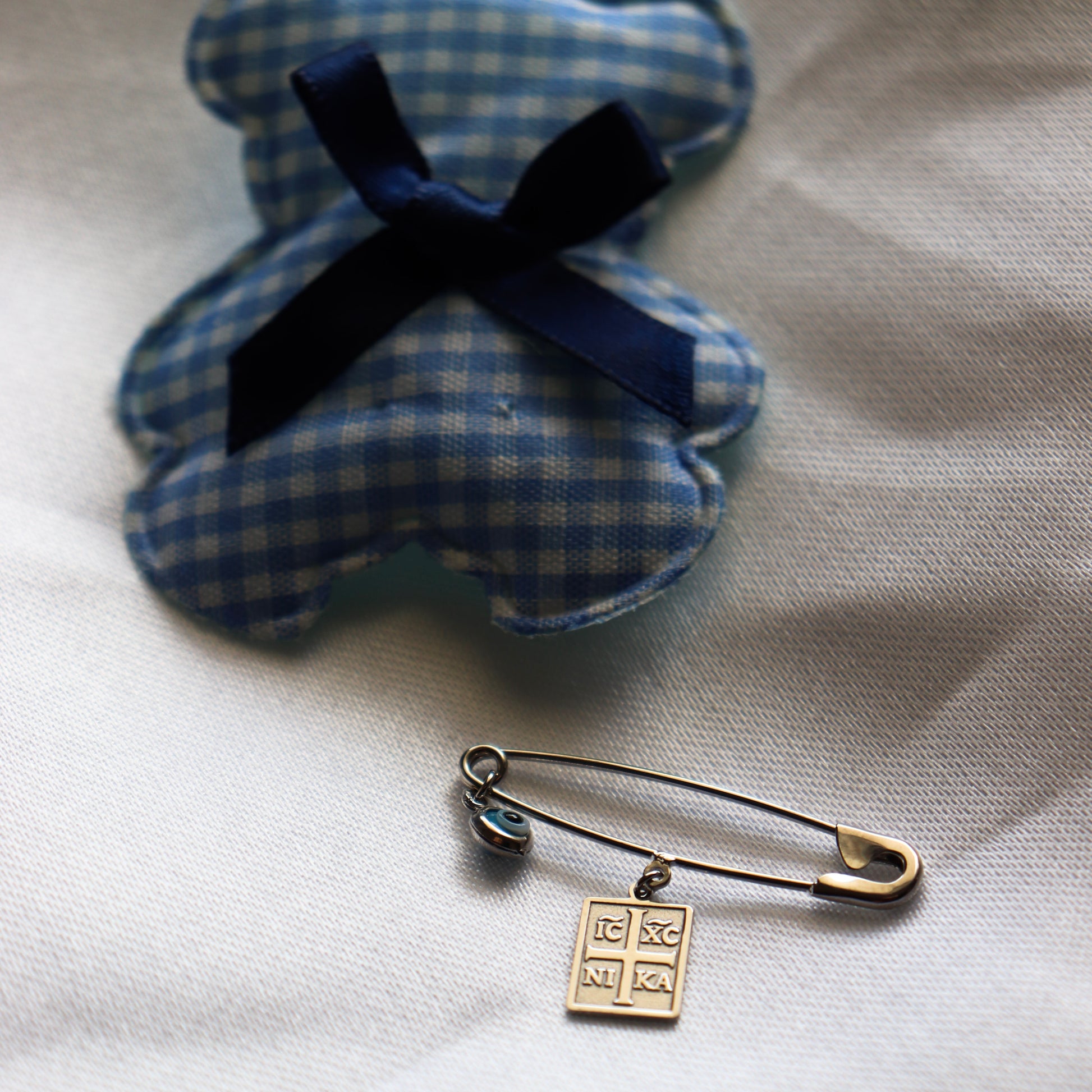 Παιδική παραμάνα από ασήμι 925ο με ένα κωνσταντινάτο και ένα μπλε ματάκι.Ιδανικό δώρο για ένα νεογέννητο καθώς μπορεί να μπεί στο κρεβατάκι του και στο καρότσι του.